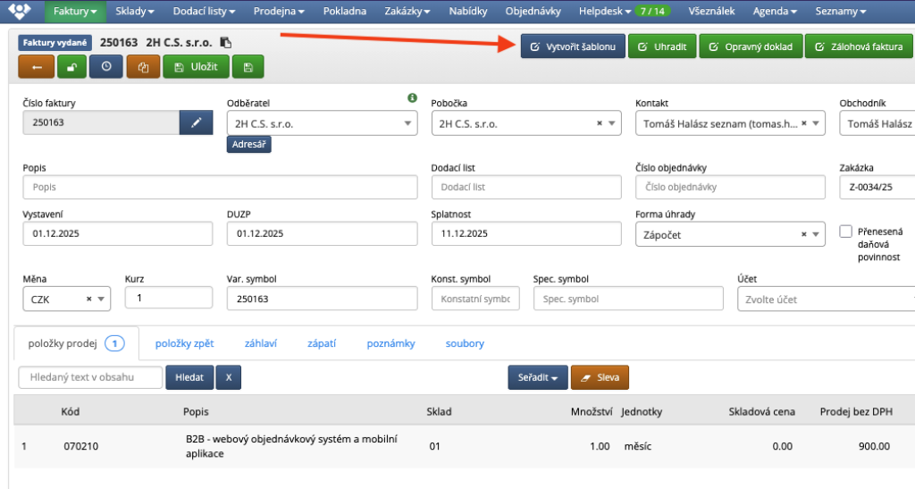 - faktury z šablony vytvoříte jednoduše kliknutím na tlačítko "vytvořit faktury dle šablony"