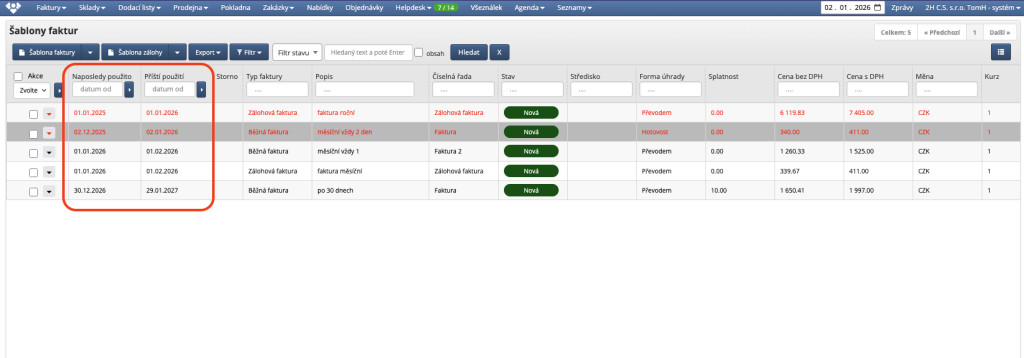 - seznam šablon je ve výchozím stavu seřazen podle data příštího použití šablony. Hned při otevření modulu "šablony" tak vidíte, které šablony jsou "na řadě" a čekají na vystavení faktury.